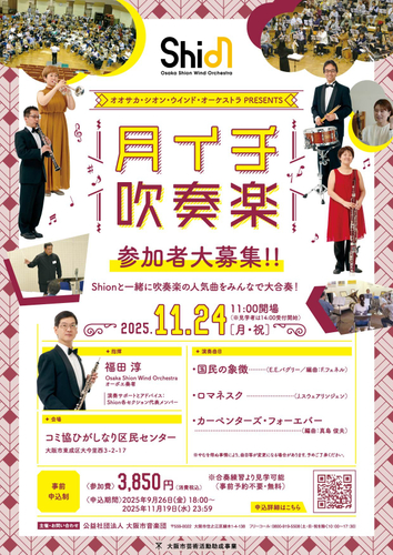 日本で最も長い歴史と伝統を誇る交響吹奏楽団のOsaka Shion Wind Orchestraを有する公益社団法人 大阪市音楽団(本社:大阪市住之江区/理事長:石井徹哉)は、月に一度、楽器を持っている方が集まって、Shionメンバーと一緒に吹奏楽曲を演奏できる人気イベント「月イチ吹奏楽」を2025年11月24日(月・祝)に開催いたします。
