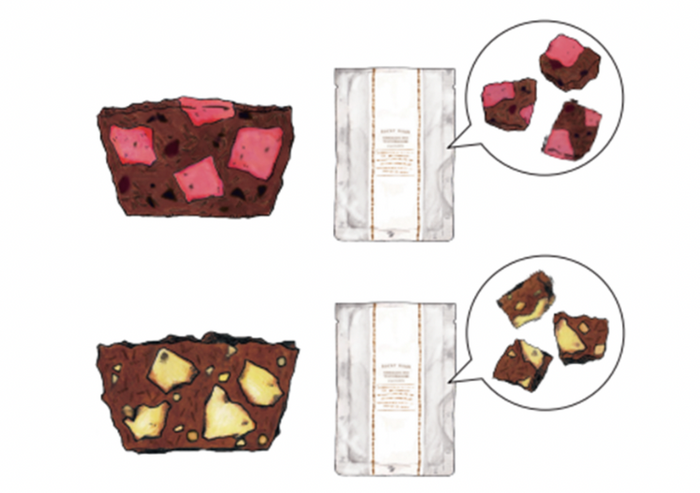 1つ目は「キャラメルフランボワーズロッキーロード」(写真上)。キャラメルミルクチョコレートの中に濃い目のフランボワーズマシュマロとドライフルーツ、アクセントにフランボワーズバブレッツが入っており、チョコ×フランボワーズの間違いない組み合わせをお楽しみいただけます。