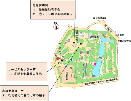 今年も向島百花園職員による七草籠制作の実演をご覧いただく見学会と、「献上七草籠」や直径約50cm、高さ約1mの「ジャンボ七草籠」、「地植えの春の七草」等の展示を行います。