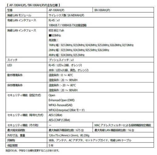 ●IEEE 802.11ahの長距離無線LANに対応した広域ワイヤレスアクセスポイント