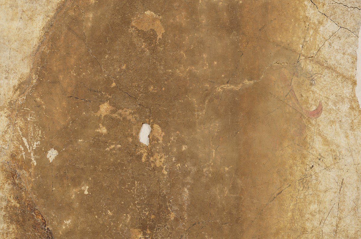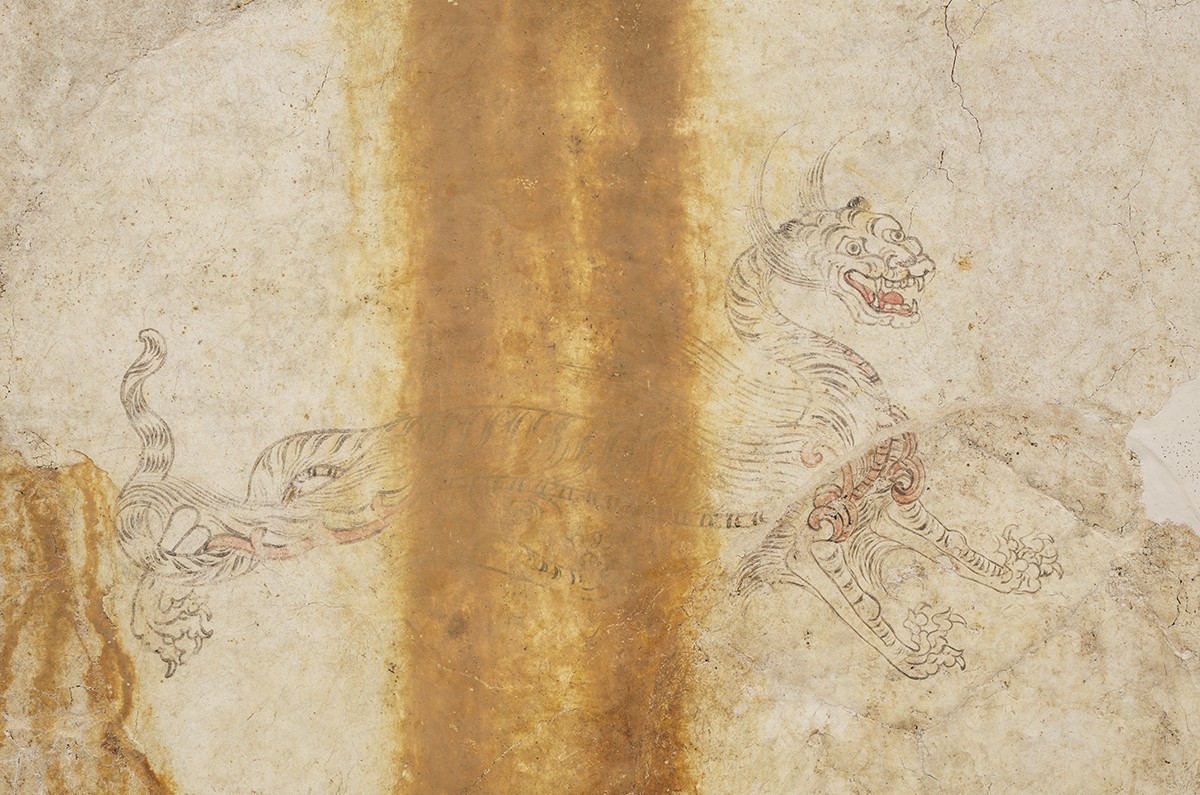 1300年余の時間が経過する中で、石室天井石材の隙間から泥土が流入し、東壁の青龍図像の大部分を覆ってしまいました。肉眼では、大きく開いた口と前脚付近がギリギリ見えるか?といった状況です。【画像2】