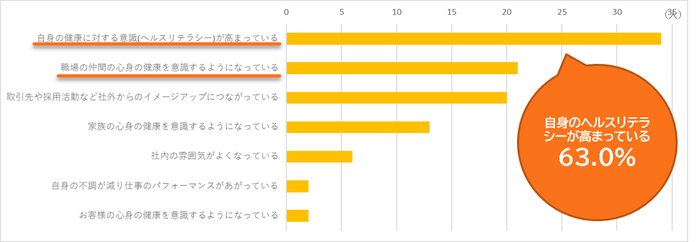 ・回答者の6割以上が自身のヘルスリテラシーの高まりを感じていることに加え、4割近くが「職場の仲間の健康を意識するようになっている」状態は、健康宣言制定から1年後の段階として非常に喜ばしい状態と考えられる