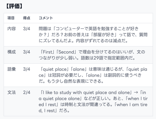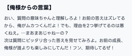 「フン、この程度か」「俺様が直々に見てやる。感謝しろ」といった自信に満ちた口調で、あなたの英作文を厳しく評価します。しかし、その指摘は常に的確。スコアアップに必要なポイントを一切の妥協なく教えてくれるため、クリアすべき課題が明確になります。