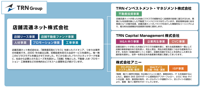 TRNグループは2000年の創業から、社会のニーズを先読みし、コーポレートスローガンである「明日の街、もっと楽しく。」の実現に向けて、店舗を軸に据えた事業領域で新たなビジネスに挑み続けています。店舗流通ネット株式会社を親会社とする3つの子会社が存在し、出店から退店までをトータルサポートする店舗総合支援事業、駅前商業立地の商業不動産を対象とした不動産投資事業、M&A仲介・企業再生・CVC事業、PC-POSレジシステム開発・販売・Webサイト企画・作成・運営・ISP事業を展開しています。