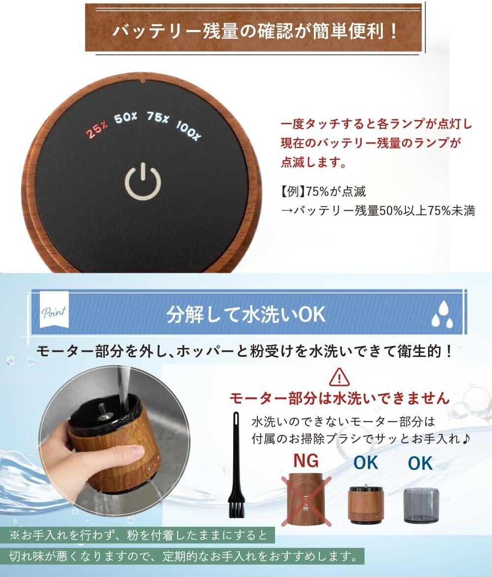 リンクスはホッパー・本体・粉受けの3つのパーツに分離させることができます。ホッパーと粉受けは直接水洗いができ、本体は付属のブラシを使って簡単に掃除ができます。日々の使用にストレスなくお手入れができるのも便利なポイントです。
