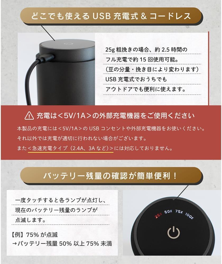 ホッパーにコーヒーミルを入れたら、挽き方の粒度を決めて電源ボタンを押すだけでコーヒー豆の粉砕が開始します。コーヒー豆の粉砕が完了すると自動で停止しますので、粉砕中は、自由に時間を使えます。また、リンクスはリチウムイオン電池を搭載している充電式ですので、毎回コンセントを繋ぐ手間もなく、使う場所を選びません。