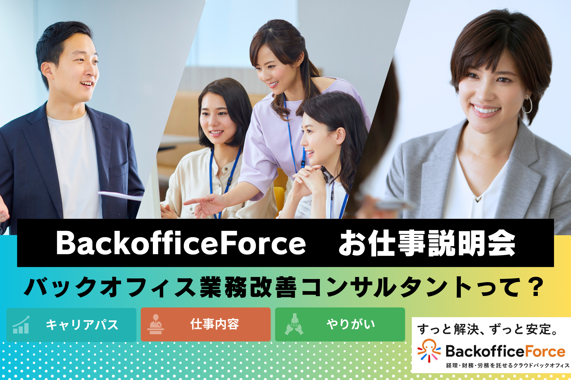 BackofficeForce株式会社(本社:東京都港区、代表:筧 智家至)は、バックオフィス人材向けに「業務改善コンサルタント」という新しいキャリアの形をお伝えする、お仕事説明会を定期的に開催することを決定いたしました。