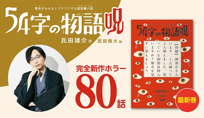 株式会社PHP 研究所(京都市南区・代表取締役社長 瀬津要)は、『54字の物語 呪』(氏田雄介 作/武田侑大 絵/税込1,320 円)を2025年12月26日に発売します。「54 字の物語」は、わずか54 字の“正方形の原稿用紙”に収められた超短編小説です。2018年の第一巻発売以来、読書が苦手な子どもからも支持を集める人気シリーズとなり、累計発行部数は95万部を突破しています。全国学校図書館協議会が調査した「小中高生が読んだ本ランキング」(読売新聞2025/10/28 掲載)では、小学生女子と中学生男子のランキングでそれぞれトップ10入りしたことからも、人気の高さがうかがえます。最新刊の『54字の物語 呪』は、都市伝説や怪談など、小中学生が好む「ホラー」がテーマです。氏田雄介氏が全80編と78編のサブストーリーを書き下ろした、シリーズ史上最恐の1冊です。