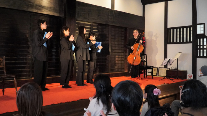 演劇サークルの学生が、関西フィルハーモニー管弦楽団首席チェロ奏者の日野俊介さんのチェロ演奏に支えられながら、見事に宮沢賢治の世界を演じきり、満員のお客様から盛んな拍手を受けていました。