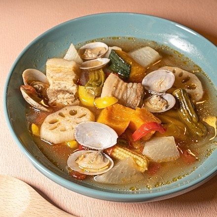フィリピンの故郷の味シニガンスープ。程よい酸味とあふれる旨味!ごろごろ豚肉にたっぷりの野菜で大満足の一品。ぜひ一度ご賞味ください。