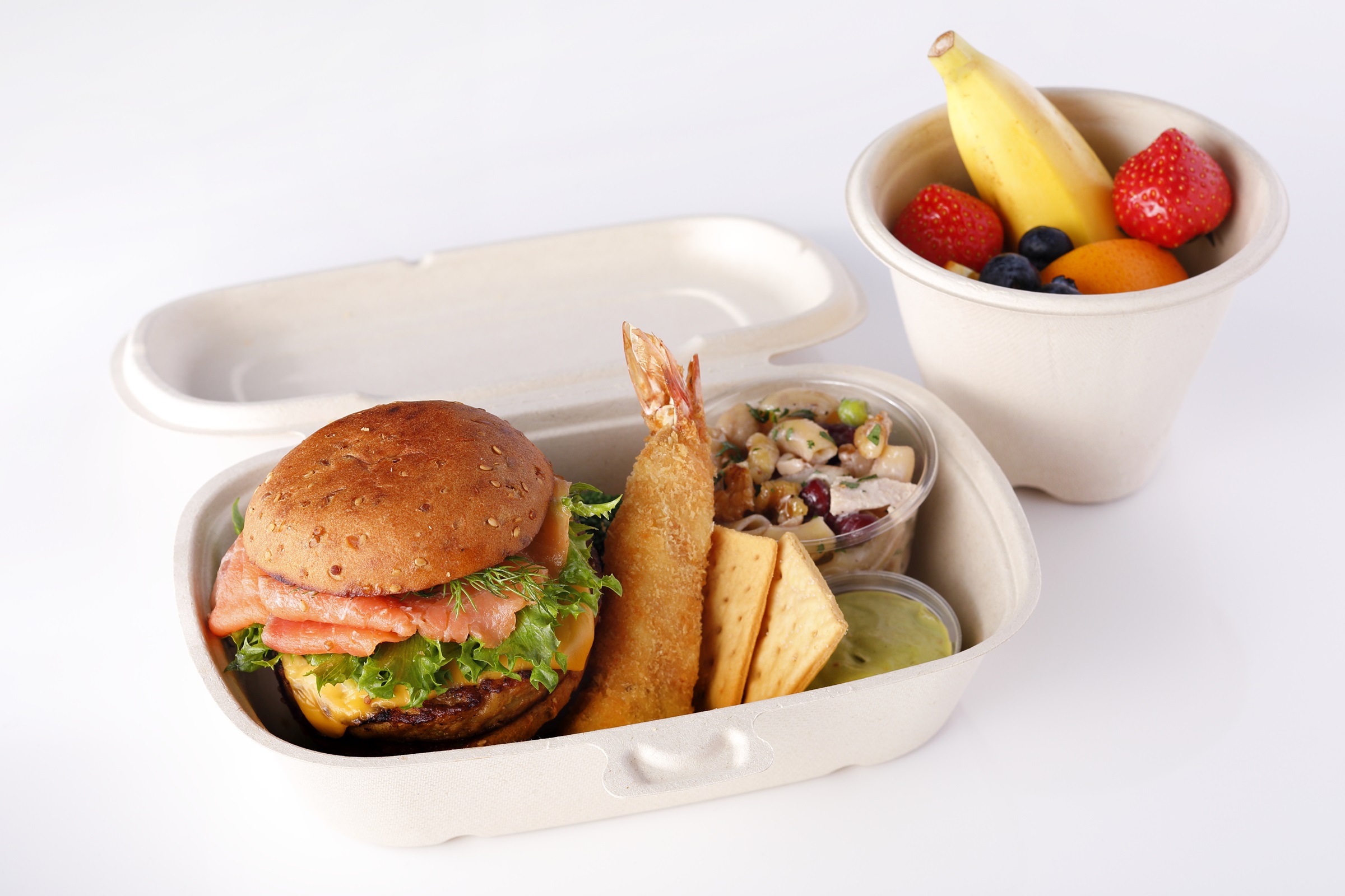 グルテンフリーの豆粉パン「ZENBブレッド3種の雑穀」をバンズに使ったおいしくヘルシーなバーガーです。「ZENBカレー」や豆のミニパスタ「ZENBミール」を使用したスパイスが香る特製パティ、スモークサーモン、フリルレタスをはさんでいます。サイドメニューには、豆のマカロニ「ZENBマメロニ」にツナ、オニオン、ミックスビーンズなどを和えたマメロニサラダや、アボカドディップを添えた「ZENBチップス」、エビフライ、トマト、ブロッコリー、各種フルーツ、焼き菓子となります。