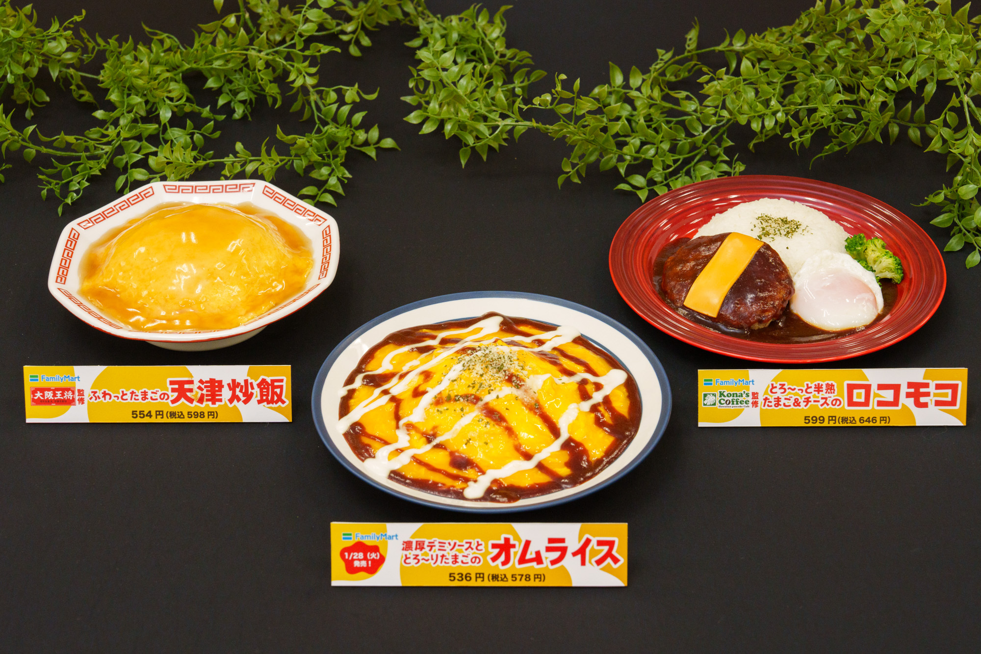 今回の調査結果より、「ふわとろ」で「濃厚」な「とろたま(半熟)」の卵料理が求められているという社会背景があることが判りました。このたび、ファミリーマートの大人気商品「オムライス」がさらにパワーアップして登場。さらに「ロコモコ」が定番商品のコナズ珈琲と「天津飯」で有名な大阪王将に、この度監修いただき商品開発いたしました。皆さまの忙しい毎日に、濃厚でふわとろな卵で満足感とバリエーション豊かな美味しさをお届けします。