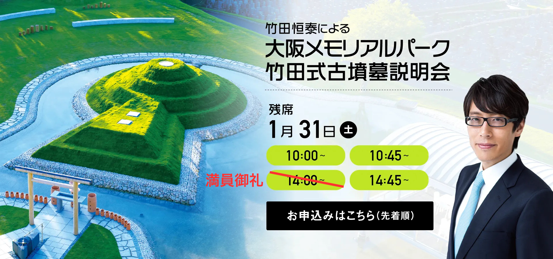 「古墳同窓会」の前日となる1月31日(土)には、大阪メモリアルパーク現地にて「竹田式古墳墓説明会」を開催します。歴史、デザイン、永代供養、そして眺望が揃った現地を実際にご覧いただける機会です。