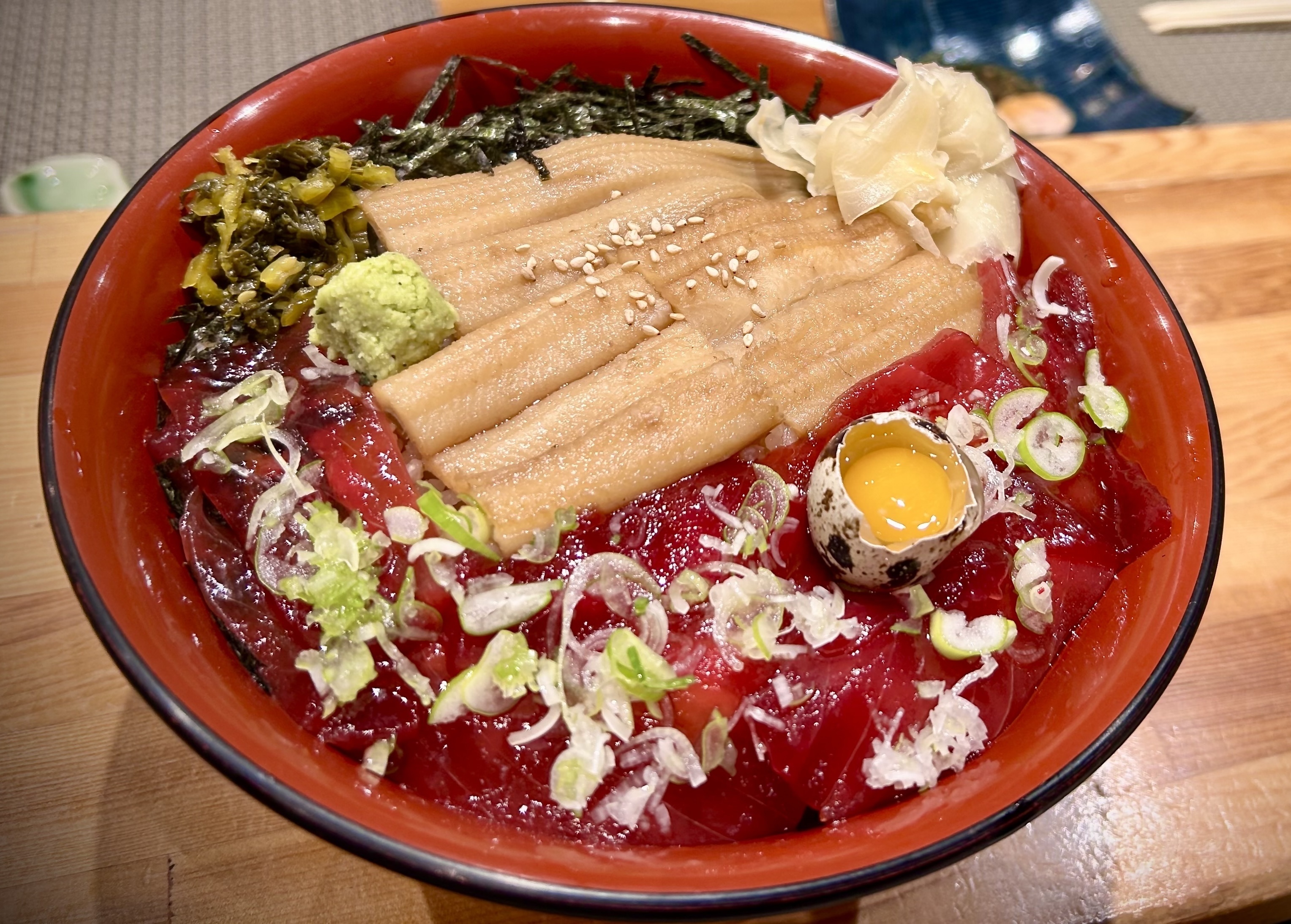 思い出深いのは、両親を連れて行き、初任給でご馳走したことです。私が就職した年にオープンしたので、一緒にキャリアを重ねている感覚で、毎年、大将の握りをほおばりながら「あれから〇年か~」と思い出に花を咲かせています。ランチで一番人気の「づけ穴ちらし」は、高級感のある丼ぶりの蓋を開けると、大ぶりだけれどふわふわで柔らかい”煮あなご”とうずらの黄身の乗った味わいの深い”漬けマグロ”がで迎えてくれます。シャリの中をほぐすと、たこ、えび、とびっこ、たまごなど、大将がこだわり抜いたネタたちが隠れており、ひとつひとつ味わいながら食べるこのちらしがたまりません。安心してください。いわゆる敷居の高いお寿司屋さんではなく、清潔感のある店内で、明るくにこやかな大将と会話しながら、カジュアルに絶品を楽しめるお店です。