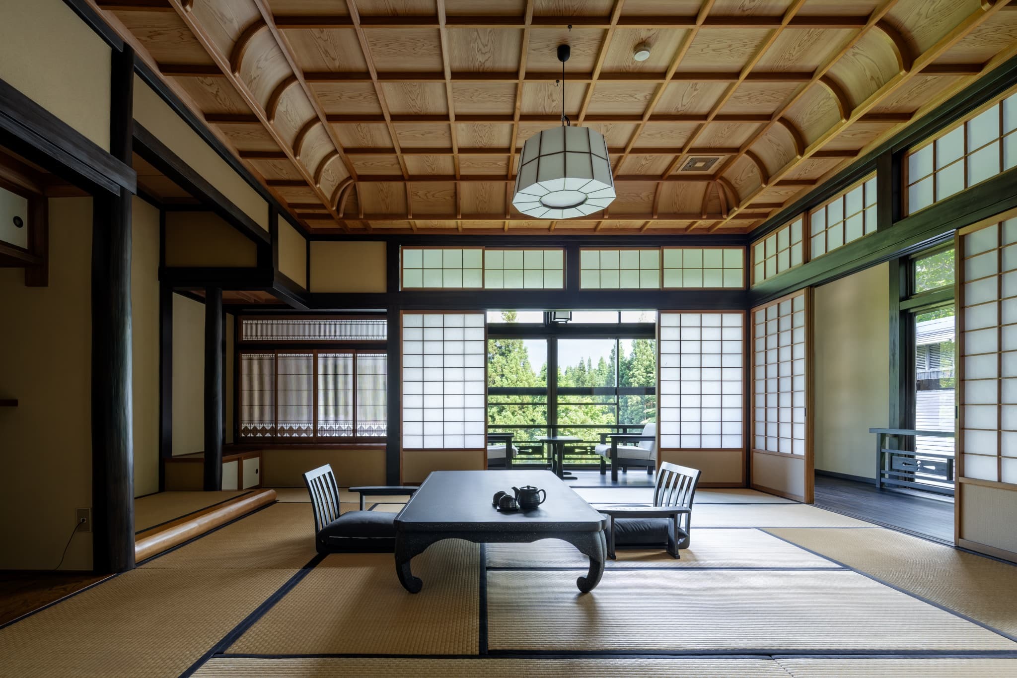 和洋室。和モダンで窓から望む山の景色もアーティスティック。