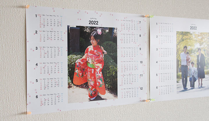 新商品『ポスターカレンダー(横)』は、PCやスマホから1年分の暦がレイアウトされたテンプレートに画像1枚を差し込むだけで簡単にA3相当サイズのポスターカレンダーが作成できます。