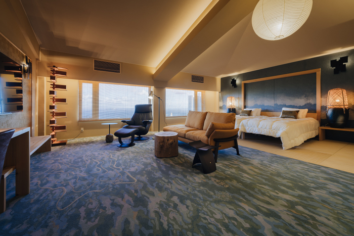 奥のダイニングスペースはヒノキの間伐材を使用した大きなダイニングテーブルに、大きな窓とその先にはテラスがあり海を見晴らす絶景をお楽しみ頂けます。2種類の浴室はそれぞれ信楽焼・桐の浴槽を備え付け熱海の温泉を楽しむことができます。2階・3階には計4つの客室があり、3人の国際的なデザイナーによって異なるコンセプトでデザインされており、伝統技法やデザイン技術、アートが凝縮された客室です。