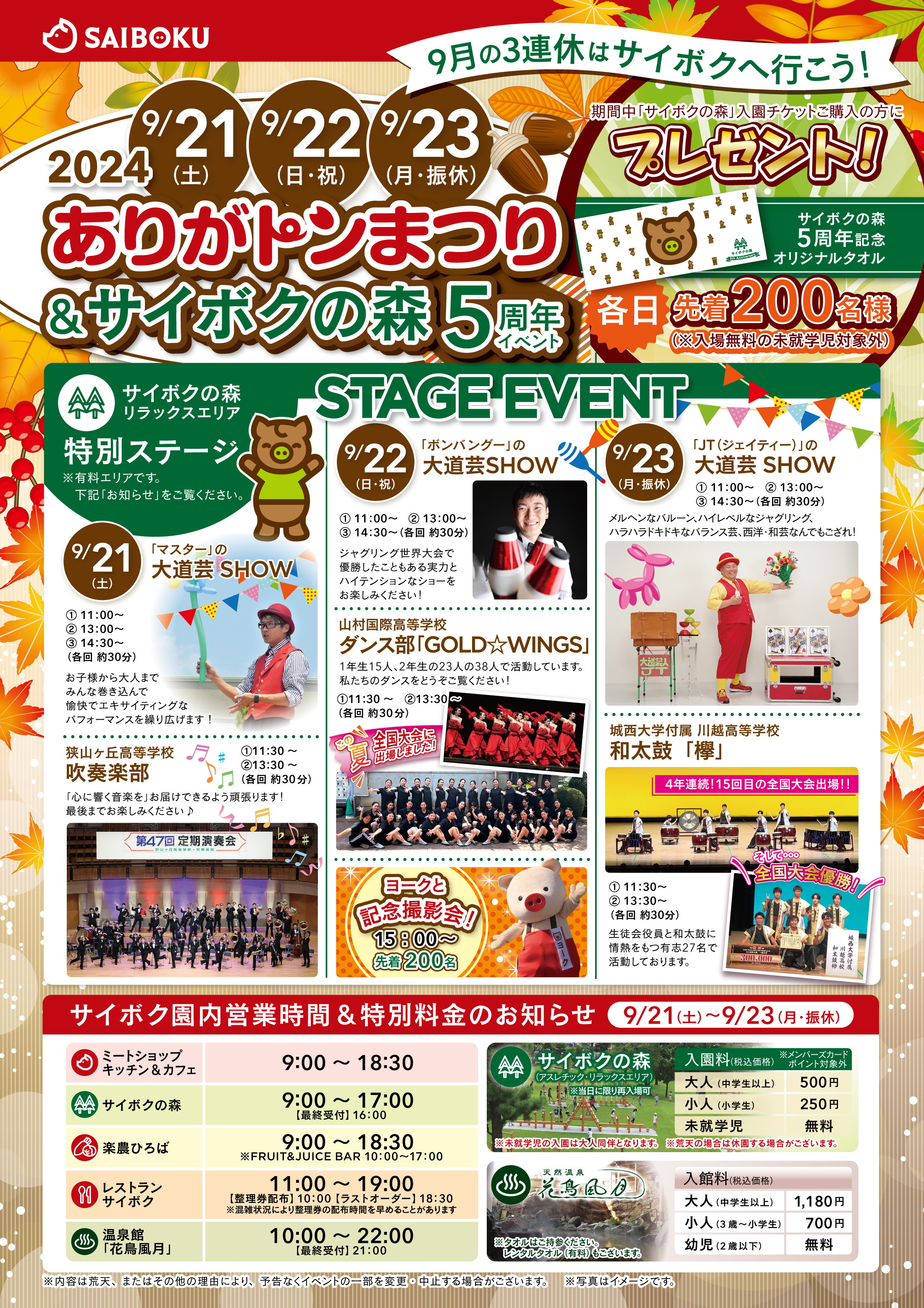 豚のテーマパーク「サイボク」がお客様感謝祭として 「ありがトンまつり&サイボクの森5周年イベント」を 9月21日~9月23日開催!