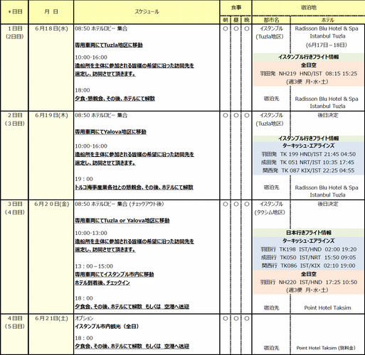 日本からの航空券は、皆様各位でご手配頂く事としていますが、当方経由での手配も承ります。日本・トルコ間は、今回の視察旅行に協賛頂きますターキッシュ・エアラインズが羽田、成田、関西から直行便を運航しています。また、全日空も羽田から直行便の運航を開始しています。また、ターキッシュ・エアラインズでは、イスタンブル経由で欧州などへの移動も容易となりますので、行きもしくは帰りのイスタンブルのトランジットを活用したツアー参加も可能です。