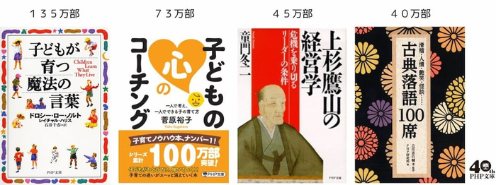 創刊に際し、会田雄次『逆説の論理』、山本七平『勤勉の哲学』ほか、扇谷正造、大和勇三、竹村健一各氏の名著5点をラインナップしました。その後、ビジネスや経営、哲学から心理学、健康、子育てまで、ジャンルを広げながら40年にわたって刊行を続け、これまでに発行した総タイトル数は約4,500点にのぼります。ミリオンセラーとなった『子どもが育つ魔法の言葉』(ドロシー・ロー・ノルト著)をはじめ、『上杉鷹山の経営学』(童門冬二著)、『子どもの心のコーチング』(菅原裕子著)、『古典落語100席』(立川志の輔選・監修/PHP研究所編)などは、今も増刷を重ねています。長く読み継がれる作品を選びぬき、今後も良質な作品を読者のもとにお届けいたします。
