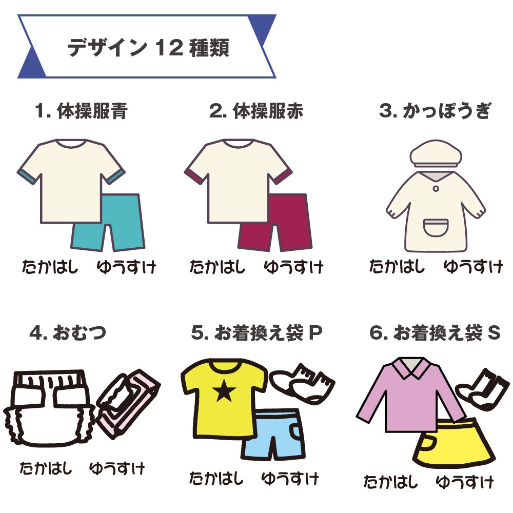 持ち物の種類に合わせて選べる、かわいらしいイラスト入り。お子さまでもすぐに自分の袋がわかります。