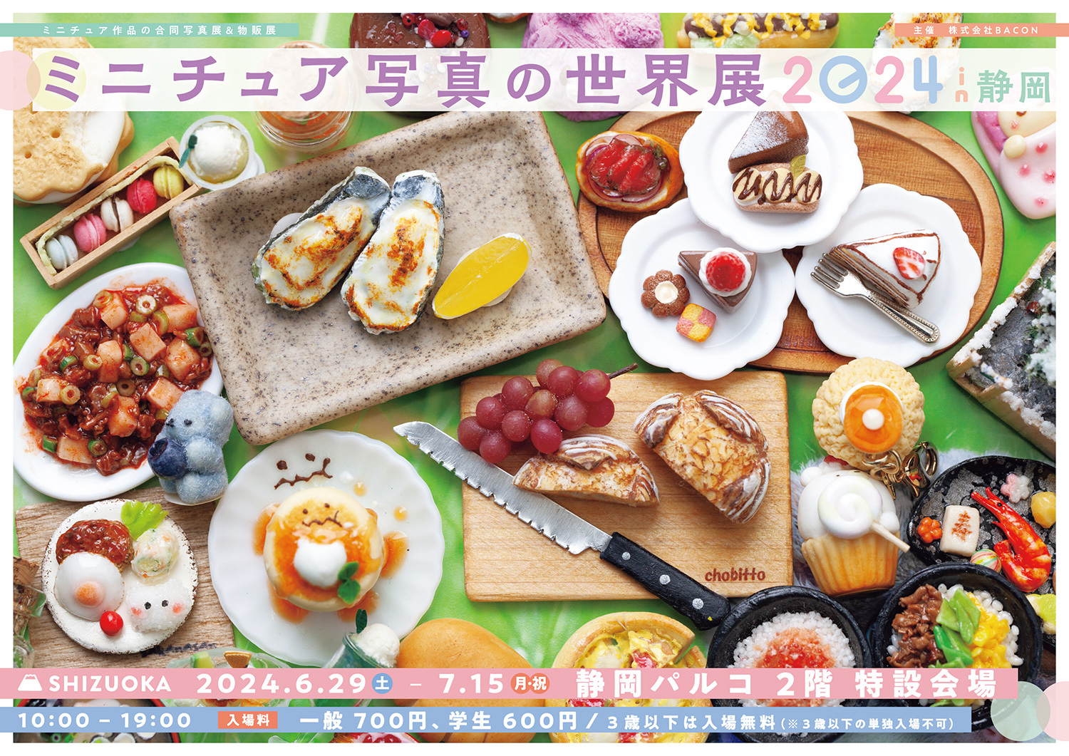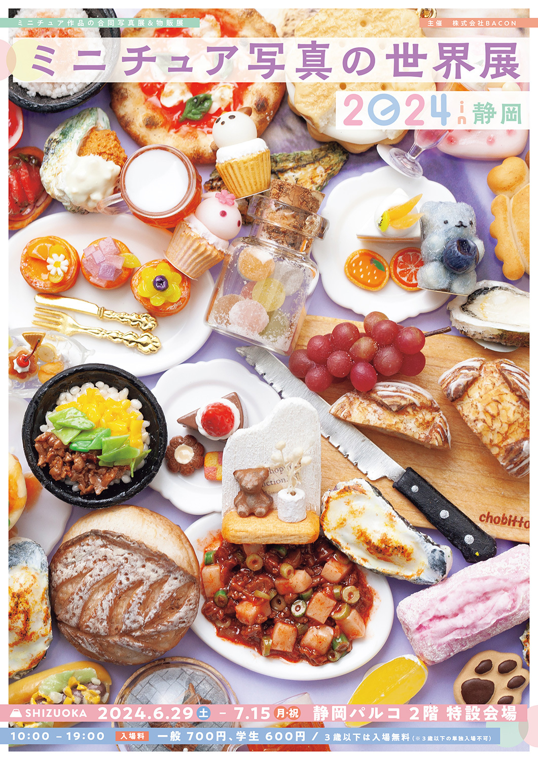 株式会社BACON(べーこん)は、静岡パルコ(静岡市葵区)において、本物かと見間違うほど精巧に作られたミニチュアアートの合同写真展&物販展「ミニチュア写真の世界展 2024 in 静岡」を2024年6月29日(土)~7月15日(月・祝)に3年ぶりに開催します。静岡初上陸となるミニチュアアート真髄の新作立体作品に加えて限定グッズも多数展開予定です。さらに、7月20日(土)~7月28日(日)には「スイーツアートの世界展 2024 in 静岡」も決定!!驚きと創造が織り成すミニチュア&スイーツの奇跡を体感していただけます!