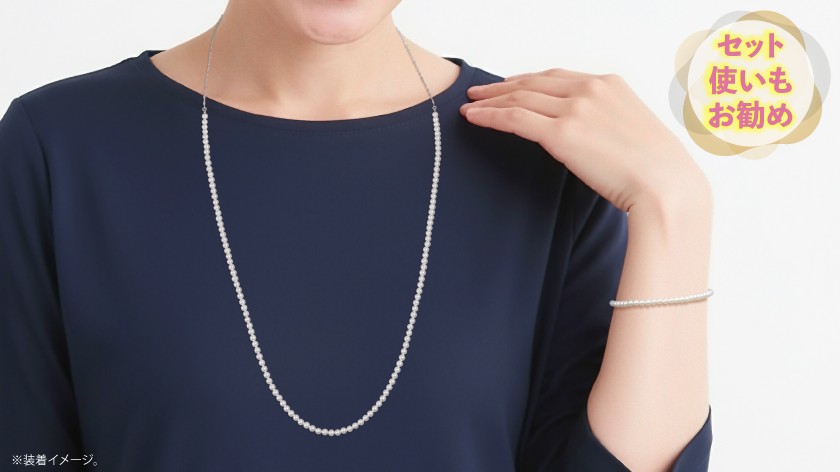 有核淡水真珠は、お値段も魅力的です。ネックレス、ブレスレットともに、長さの調節ができるのでコーデに合わせやすく、四季を通してお使いいただけます。