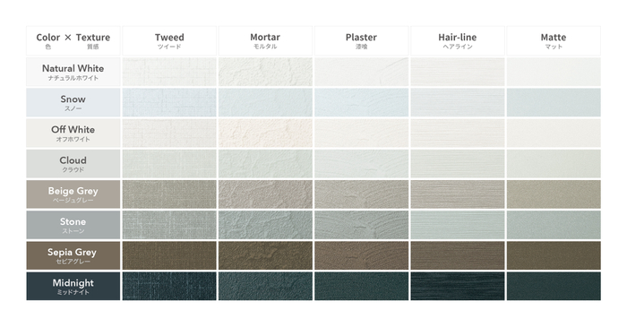 人気のモノトーンを基調としたカラー8色に、壁紙で用いられる定番の質感5柄を掛け合わせた、合計40種からインテリアと調和するデザインが選べます。