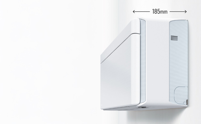 シミュレーションを繰り返し行い、奥行き185mmの薄さを実現しました。部屋の高い位置にあるエアコンのデザインとして、正面パネルに「隙間」を設けることで、圧迫感のない軽やかなデザインに仕上げています。