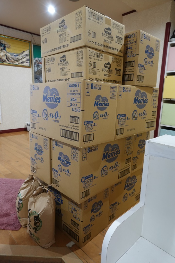 おむつ Mサイズ10箱、Bigより大きい10箱、おしりふき 2箱、お米 10kg