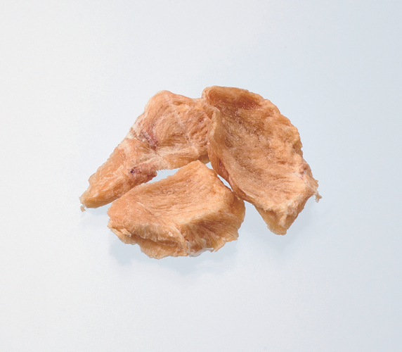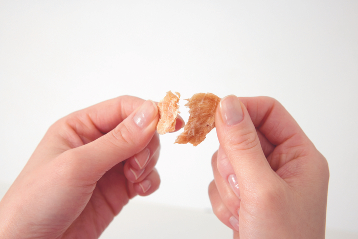 割らずに済む2-3cmの小粒サイズ、指で簡単に割れるサックリ感を重視したドライタイプの3種、「しらすせんべい」「ささみジャーキー」「カツオチップ」。食べやすいキューブカット、ほぐしやすい柔らか食感を重視した2種、「スモークかつおキューブ」「スモークチキン」。いずれも愛猫の気分や好みを試すことができる、小さめサイズで仕上げました。さらに細かくしたい時でも簡単に指で割れます。
