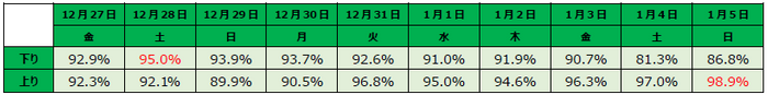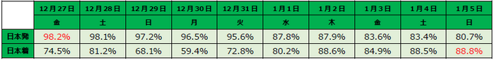 スプリング・ジャパン 2024年度 年末年始期間ご利用実績 スプリング・ジャパン株式会社 2025-01-06 16:00 2024年度年末年始期間(2024年12月27日(金)~2025年1月5日(日))のご利用実績を取りまとめましたので、ご報告します。 【国際線】 ◆提供座席数・搭乗数・搭乗率 ※()内は前年同期値。 ※ウェットリース便の実績含む。 ◆日別搭乗率 ※日本発・日本着それぞれ、一番高い搭乗率を赤で表記しています。 【国内線】 ◆提供座席数・搭乗数・搭乗率 ※()内は前年同期値。 ◆日別搭乗率 ※下り・上りそれぞれ、一番高い搭乗率を赤で表記しています。 ジャンル: 旅行・お出かけ 画像一覧 一括ダウンロード