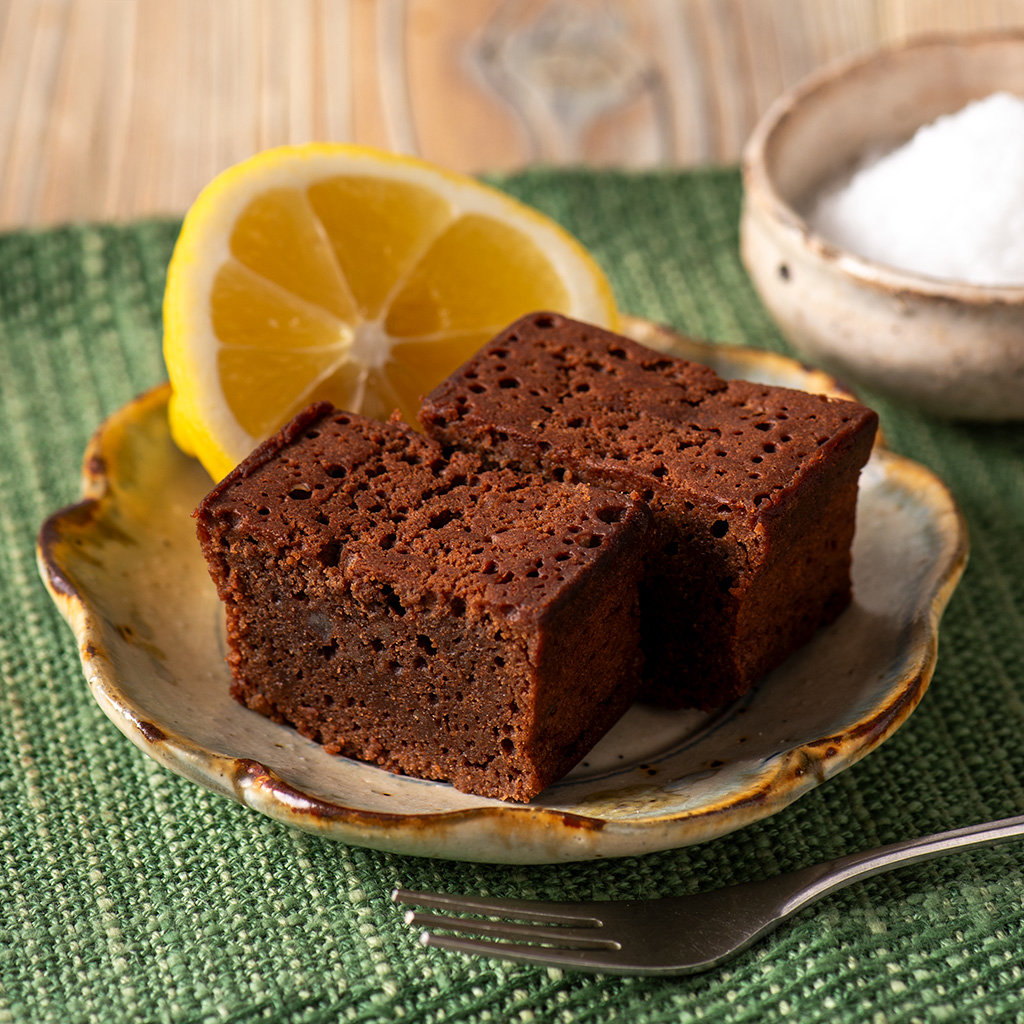 こっくりと濃厚な味わいなチョコレートケーキですが、一口食べるとレモンの風味が軽やかに広がり、後味はサッパリとしています。まろやなかな塩味が特徴の長崎県五島列島産の塩を加えることで、チョコレートの甘みがグッと引き締まり、味わいに奥行きが生まれます。何度も試行錯誤を重ねた末にたどりついた「チョコレート」「レモン」「塩」の絶妙なバランスをご堪能ください。