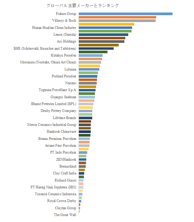 本市場は多数のブランドが存在しながらも、トップ10企業が売上ベースで約4.0%のシェアを占める分散型市場である。主要企業としては、Fiskars Group、Rosenthal GmbH、Villeroy & Boch、Steelite International、Hunan Hualian China Industry、PT. Lucky Indah Keramik、Vista Alegre、Lenox(Oneida)、Arc Holdings、RAK Porcelainなどが挙げられる。欧米ブランドはデザイン性とブランド歴史を武器とし、高級市場を牽引している。一方、アジア勢はコスト競争力と生産能力を背景に、グローバル展開を加速している。特にホテル・レストラン向け業務用分野では供給力の高さが競争優位を形成している。各社はサステナブル素材の導入や直販チャネル拡大など、競争差別化へ向けた取り組みを強化している。