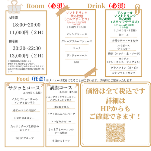ルーム代、ドリンク代が必須でフード代は任意となっています。