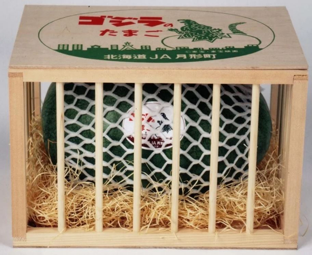 このスイカ「ゴジラのたまご」は、1991年(平成3年)、北海道樺戸郡月形町のわずか一つの農園が、栽培したのが始まりです。 果皮にしま模様が無く、ラグビーボールに似た楕円形で、“恐竜のたまご”を思わせ、 生産者自ら「ゴジラのたまご」と名付けました。果肉はシャリシャリとして口当たりがよく、後味はスッキリしています。恐竜が捕えられたような、オリの形をしたユーモアな木箱に入れてお届けします。ご家庭用、贈答用にもおすすめです。