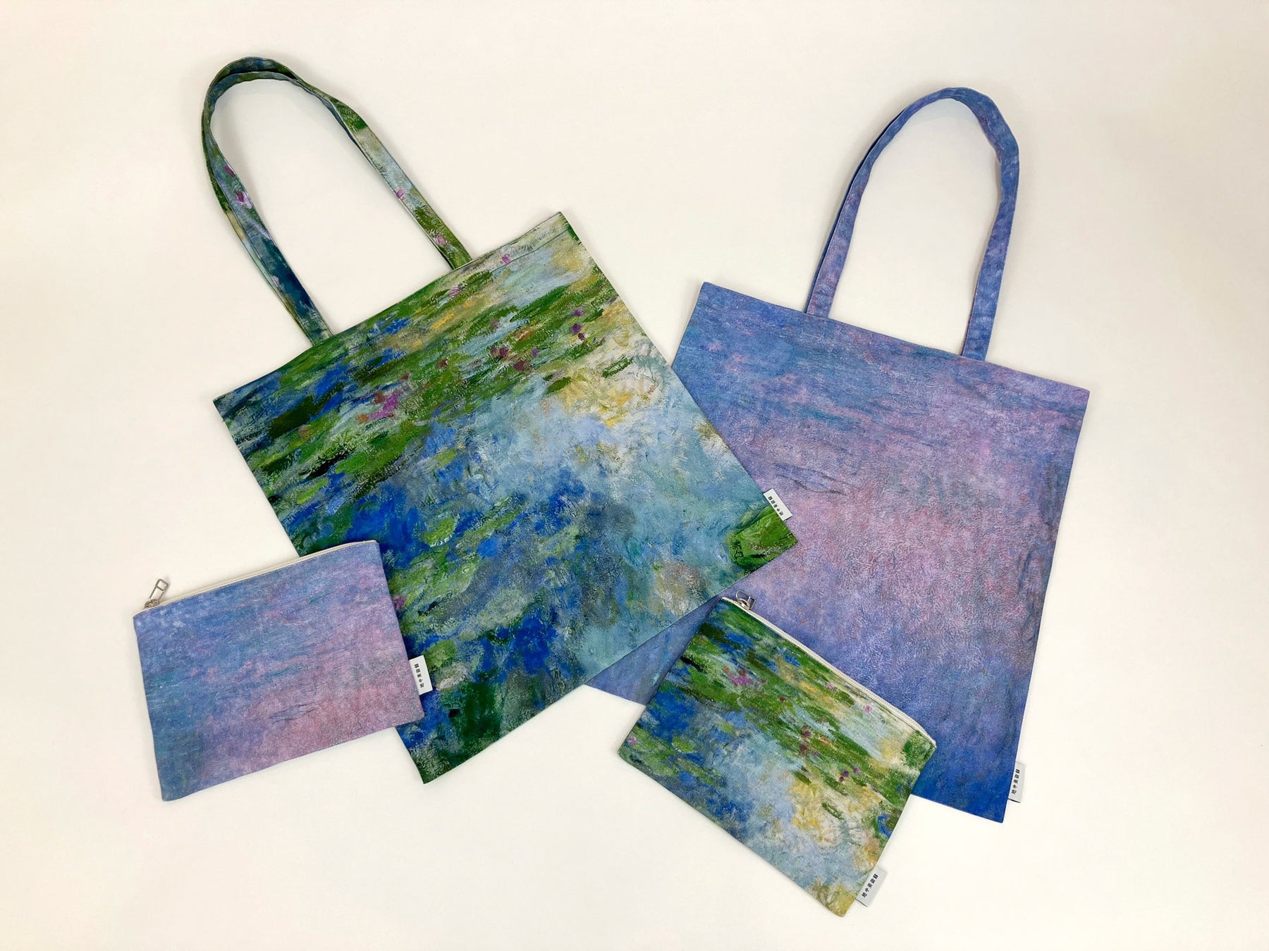FAVORRICのアート作品をデザインに落とし込む技術と、作品の再現性の高さを生かし“美術館で見た「睡蓮」や「睡蓮の池」の美しさをもっと身近に、いつも持ち歩けるようにしたい”という想いが込められた20周年記念限定デザインの「フラットサブバッグ」と「リネンポーチ」が完成いたしました。