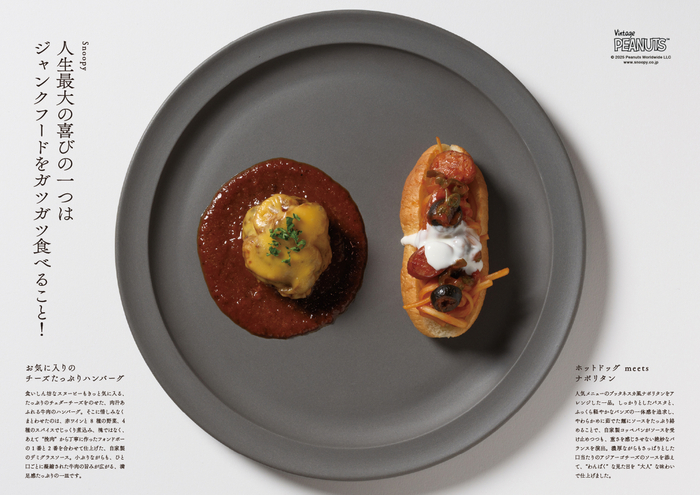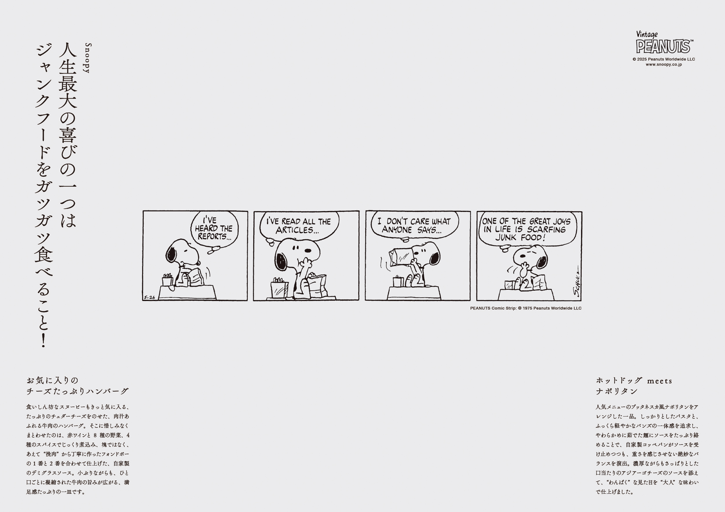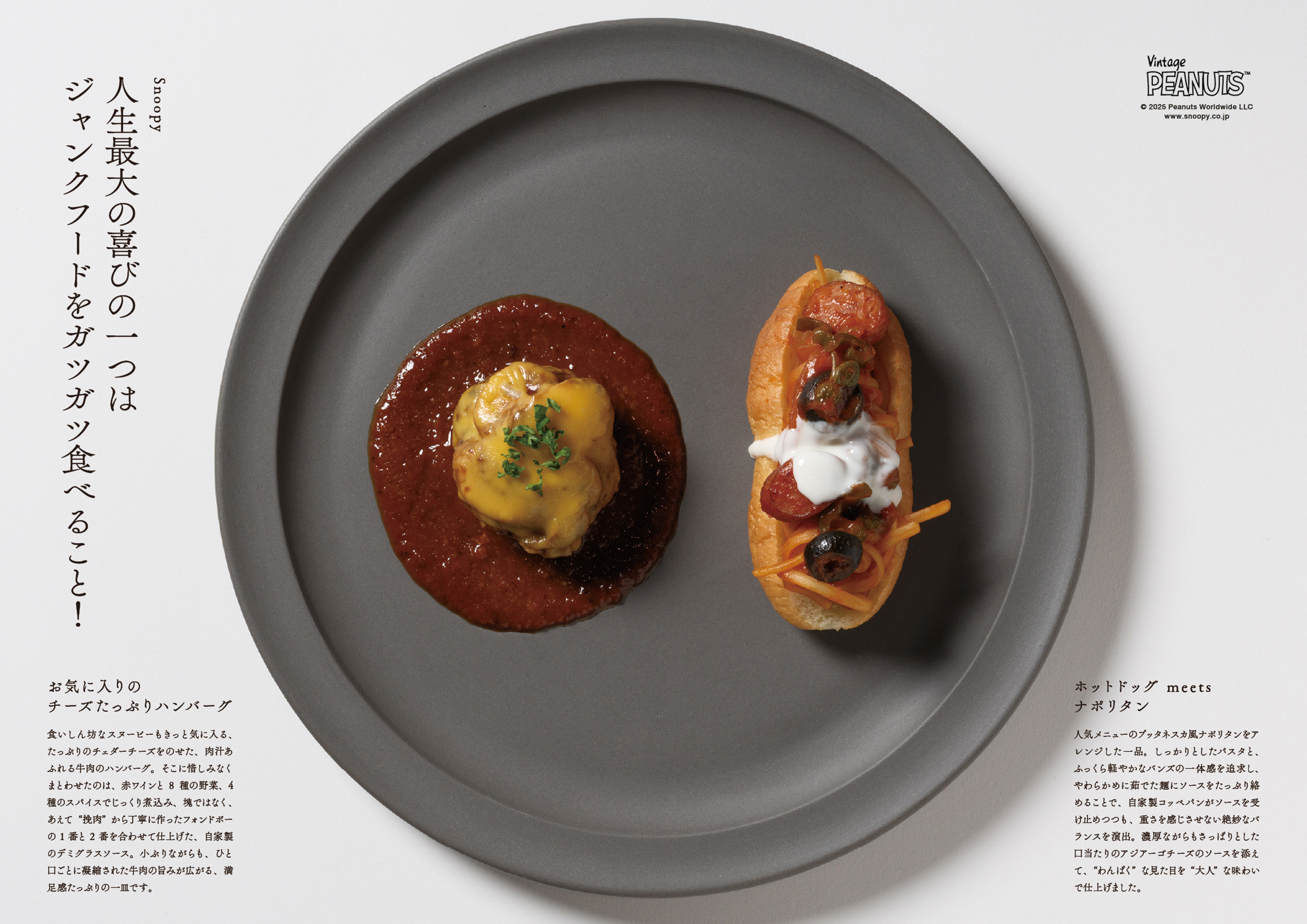 「ちょっと少ない、だから良い」という "1/2 (Nibun no Ichi)" のコンセプトはそのままに、オムライスやハンバーグ、ハヤシライスなど、定番の洋食メニューがPEANUTSの世界観と出会い、アメリカンテイストの特別なアレンジに。料理だけでなく、料理の提供時にテーブルにセットされるプレイスマットや、オリジナルデザインのメニューブックに印刷された言葉にも注目です。