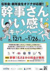 淀屋橋odona(オドナ)の飲食店で忘年会をすると 幹事様1名分の料金が無料になる!? 「幹事さん、いい感じ!キャンペーン」