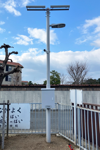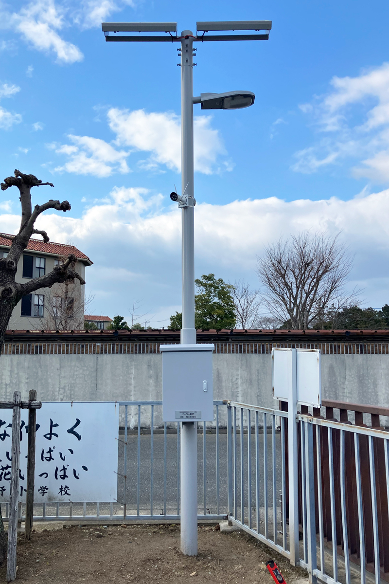 防犯カメラやWi-Fi設備、デジタルサイネージなどを搭載し、スマートポールとして活用可能です。今回、東野小学校に寄贈したソーラー街灯2基のうち1基は、防犯カメラを搭載したスマートポールです。