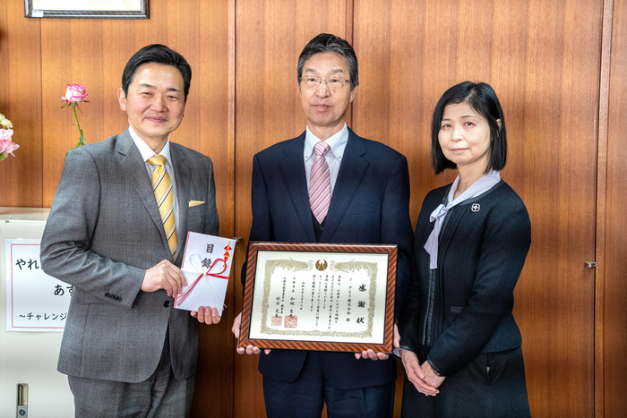 (写真左より)加地良光 小郡市長、I-PEX株式会社代表取締役社長執行役員 土山隆治、小郡市立東野小学校 廣重和代 校長