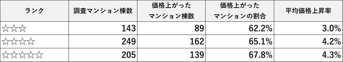 大阪府・京都府・兵庫県の分譲マンションを対象とした分析では、評価が最も高い「星5つ」のマンションの約7割で価格上昇が確認され、平均上昇率は4.3%に達しました。「星4つ」も同様に高水準の結果を示す一方、「星3つ」では価格上昇割合・上昇率ともに大きく低下しています。これらのデータは、「評価が高い」すなわち「管理状態が良好」であるほど、資産価値が維持・向上しやすいことを明確に示しています。