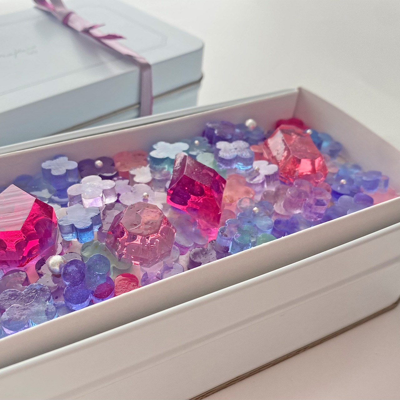福岡から発信。9割以上が子育て中の母というスタッフたちが、日々可愛く美しく、そして楽しいものづくりをしています。「ArtなFoodであそぶ」をコンセプトに、代表作鉱物みたいなお菓子「こうぶつヲカシ」(琥珀糖)をはじめ、宝石を散りばめたようなアイスケーキ「宝石のカッサータ」やオリジナルグッズを展開。食とアートを気軽に楽しみ、日常に驚きと感動のある世界を目指して福岡で活動している会社です。2020年にはハラペコラボ ミュージアムショップ&カフェをオープン。ランチやスイーツを楽しめるカフェを併設した店舗でお菓子やオリジナルグッズを販売しており、その隣にはアトリエを構えています。