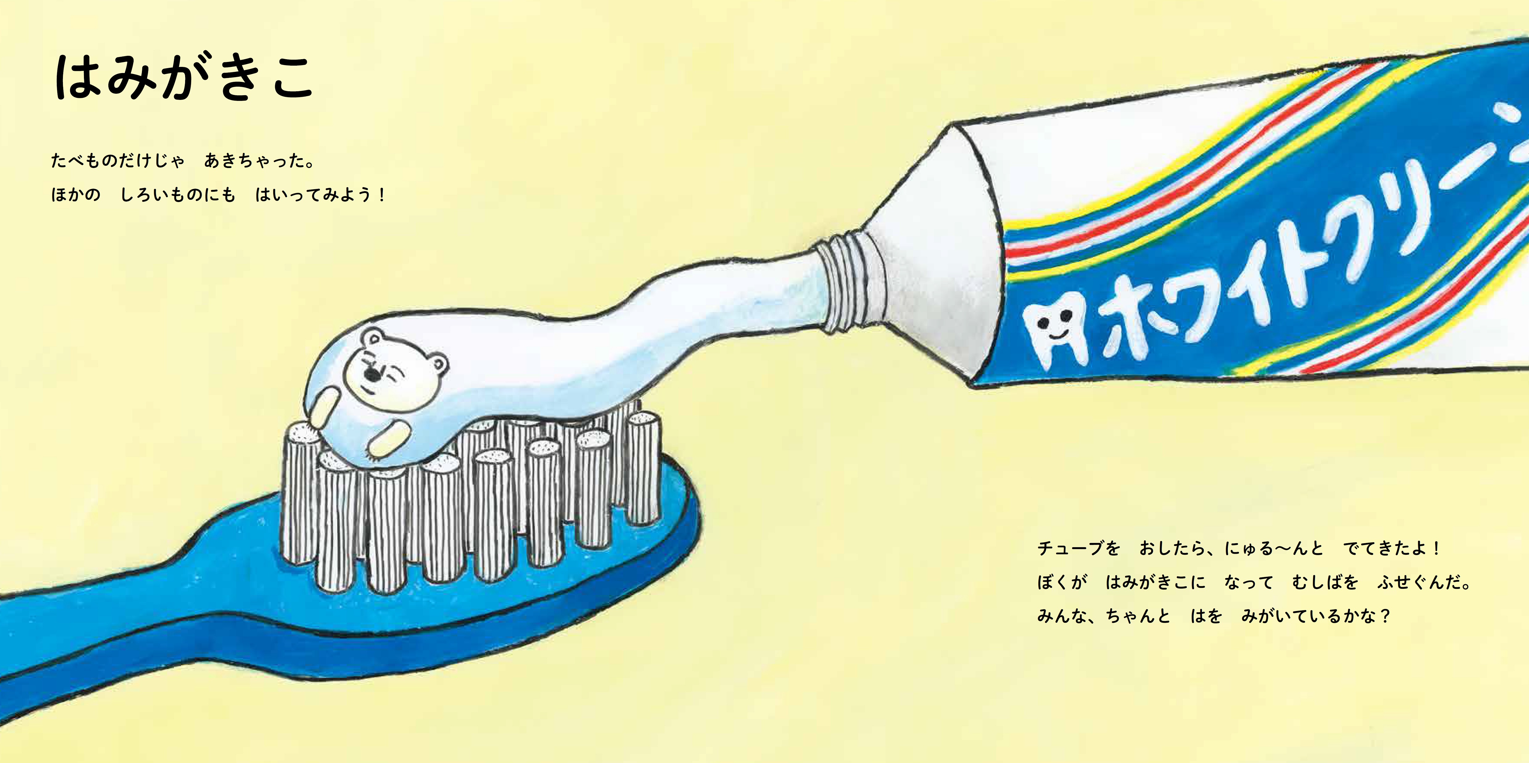 最新作『まっしろしろくま』は、食いしんぼうのしろくまが、「とうふ」「牛乳」「そうめん」など、「白い食べ物」の中に入ってみるお話です。今回は、はみがきこや雲、雪など、食べ物以外も登場します。しろくまと「白い食べ物」の「しろ×白」コラボは、「しろくまは、どこにいるかな?」というクイズにもなり、読み聞かせでも盛り上がります。読書の秋にはもちろん、クリスマスプレゼントにもピッタリの1冊です。