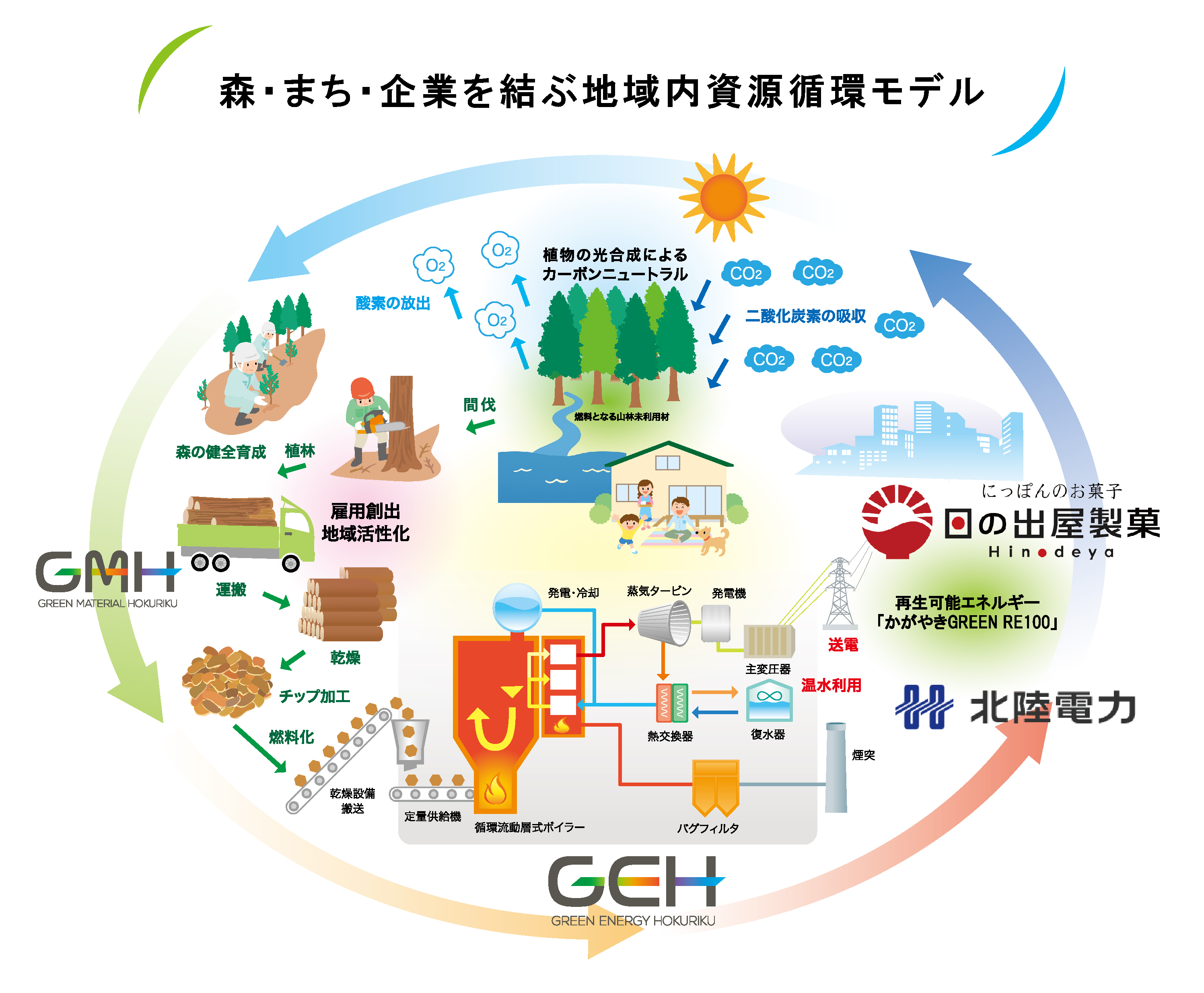 本取り組みは、当社が富山県内で行う未利用間伐材を活用したFIT認定バイオマス発電事業による再生可能エネルギーを、北陸電力株式会社の提供する「かがやきGREEN RE100」メニューを通じて供給するものです。この電力には、トラッキング付FIT非化石証書による環境価値が付加されており、供給先企業におけるCO2排出削減と森林保全への貢献を同時に実現します。
