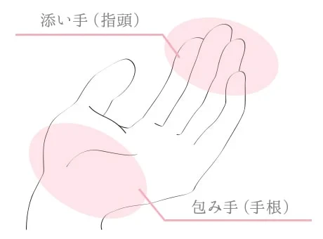 オイルエッセンスを塗布後、「すくい手」と呼ばれる、水をすくいあげるような丸みを帯びた手の形をキープして行います。過度なマッサージはせず、ゆっくりと丁寧にタッチしてください。