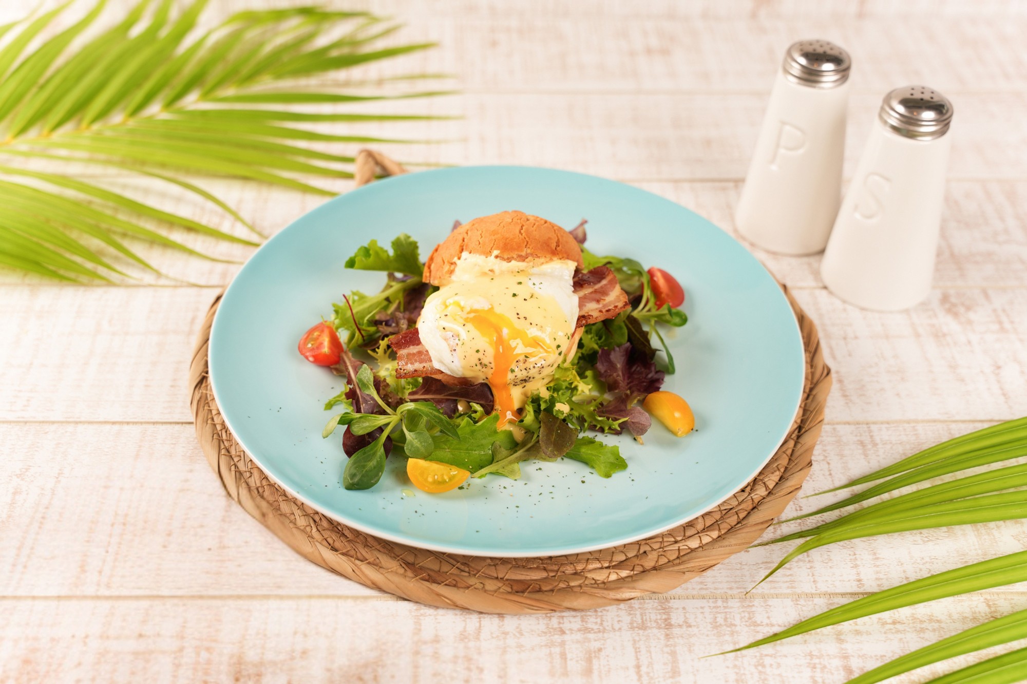 沖縄の爽やかな香りを楽しめるシークヮーサーをアクセントにした、とろーり半熟卵が絶妙に絡み合う食感も楽しいシュー生地を使ったエッグベネディクト。
