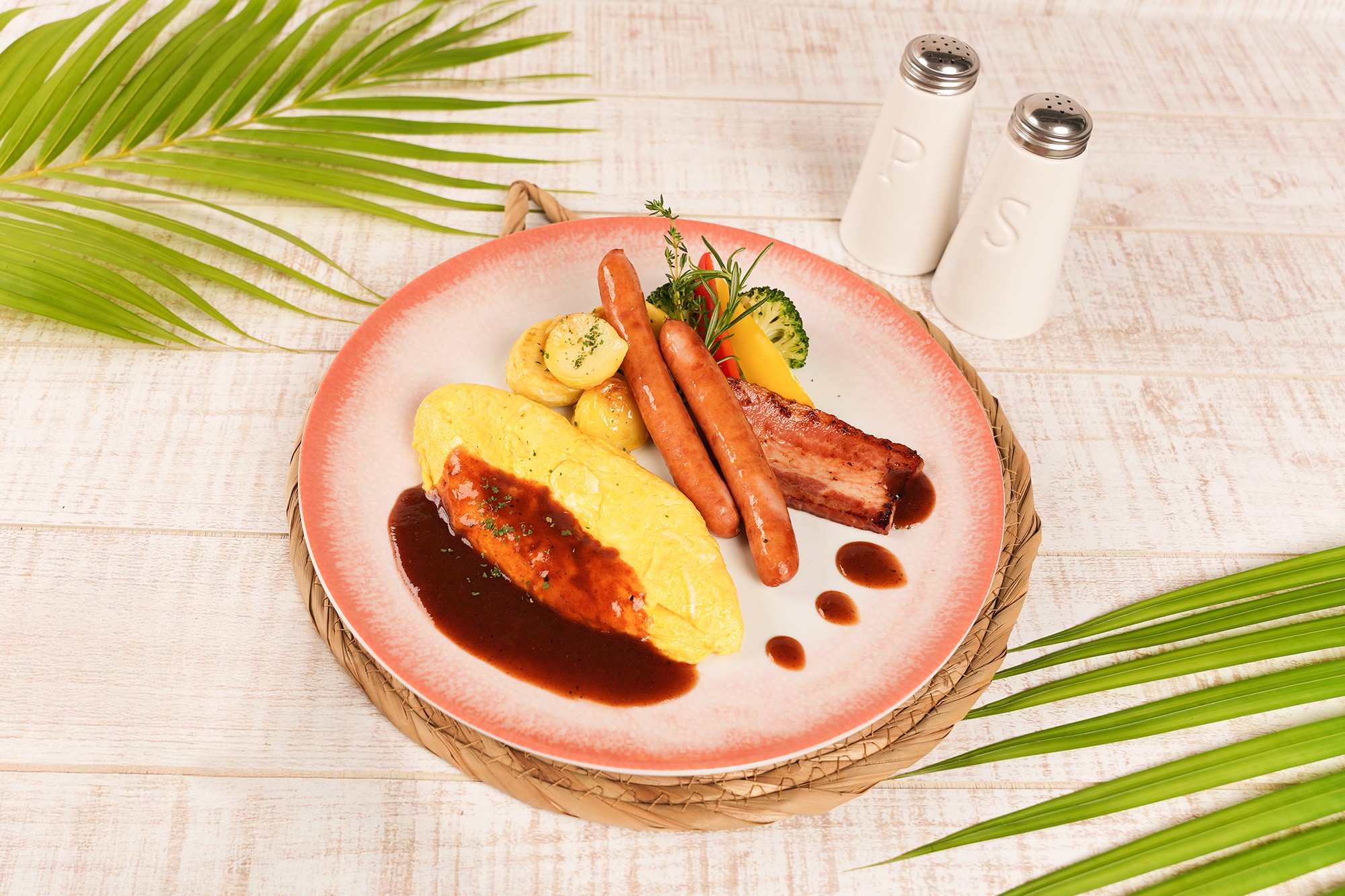 沖縄ならではのA1ソースを使ったデミソースをかけた、焼き立てふわとろオムレツにあぐーソーセージ、厚切りベーコンを添えたボリューム満点な一皿。