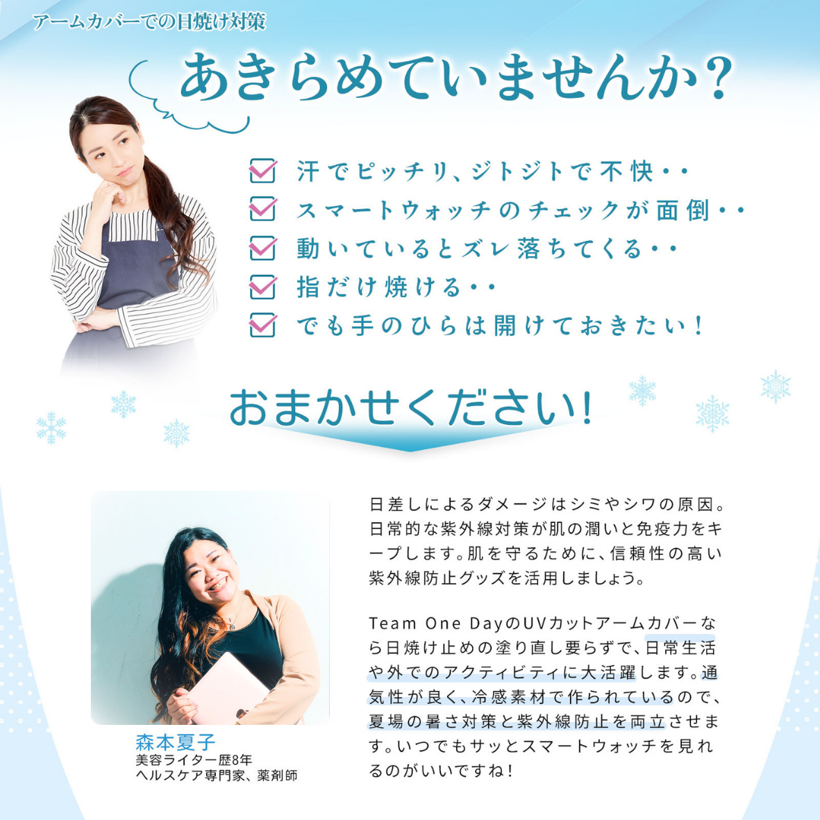 監修の森本氏「Team One DayのUVカットアームカバーなら日焼け止めの塗り直し要らずで、日常生活や外でのアクティビティに大活躍します。通気性が良く、冷感素材で作られているので、夏場の暑さ対策と紫外線防止を両立させます。いつでもサッとスマートウォッチを見れるのがいいですね!」