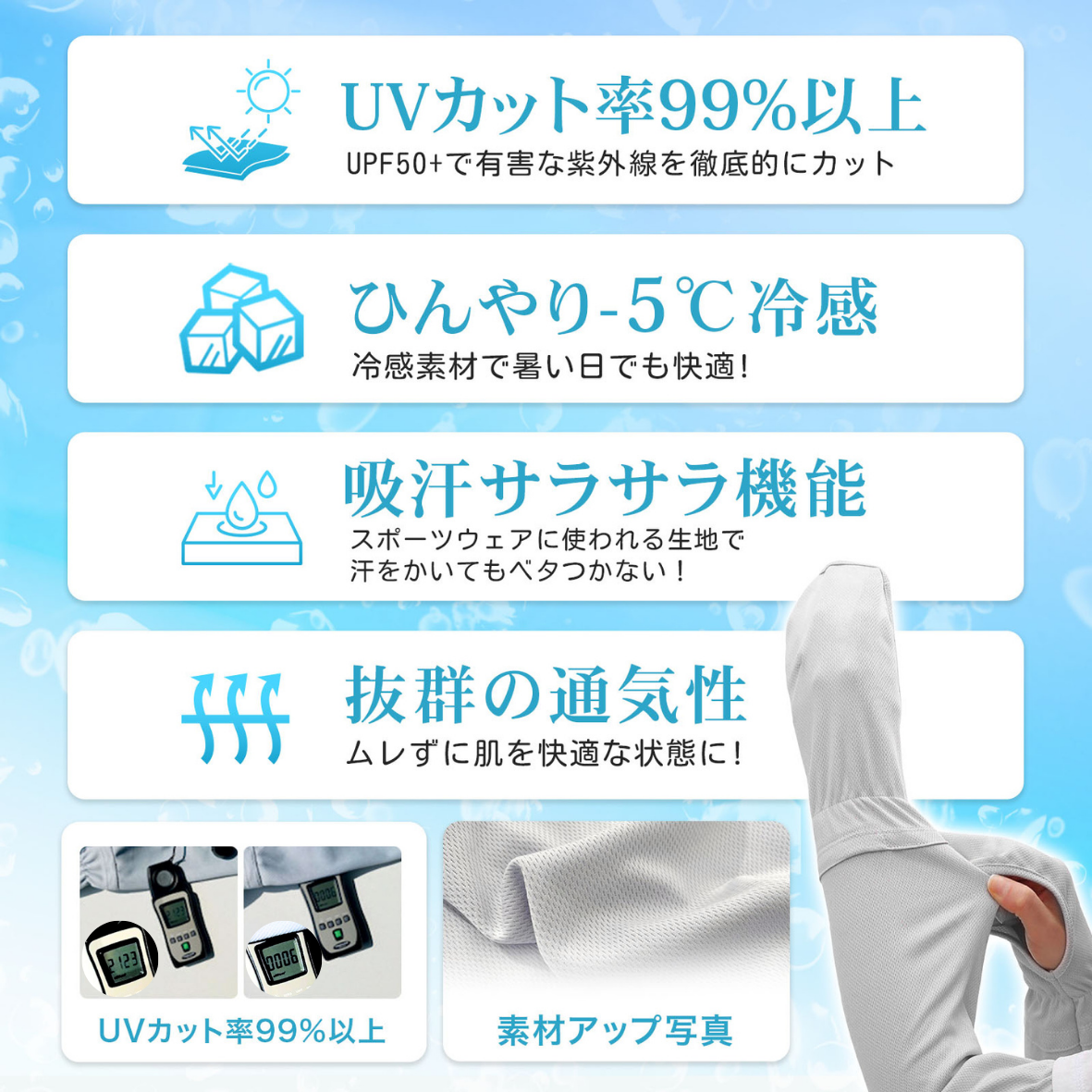 ・UVカット率99%以上のUPF50+の吸汗速乾性、通気性の高いドライ生地を使用